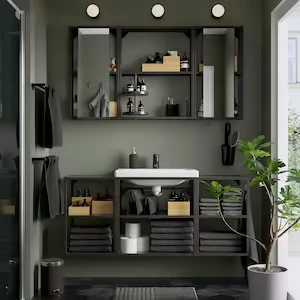 De nombreux rangements et de l’espace sur le plan de travail : une solution idéale pour la salle de bain.