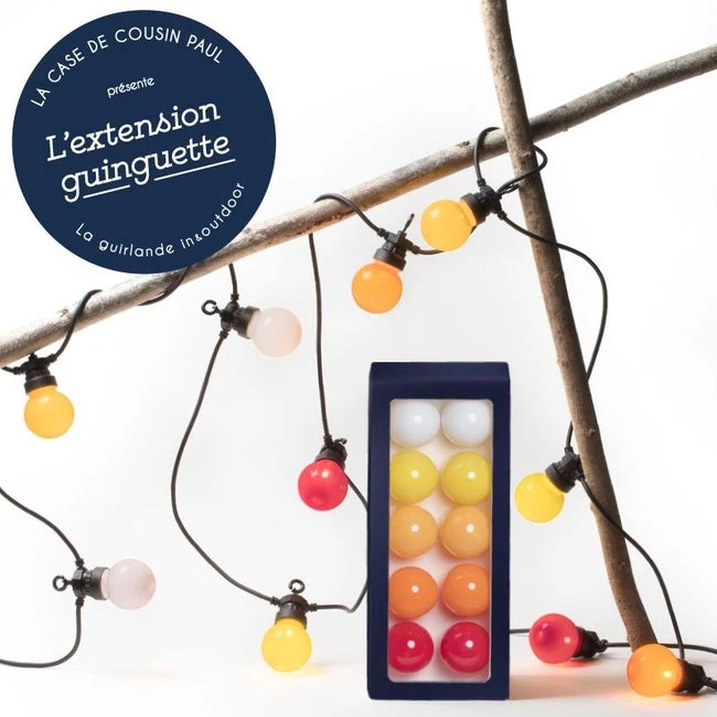L’extension pour la guirlande guinguette revisitée par Cousin Paul. Installez cette guirlande à l’extérieur pour éclairer une terrasse, un balcon et même dans les arbres. Choisissez de positionner les boules de plastiques colorés comme vous le souhaitez pour profiter d’un éclairage intense et ludique. Présentée dans un joli coffret, cette guirlande est une excellente idée cadeau !