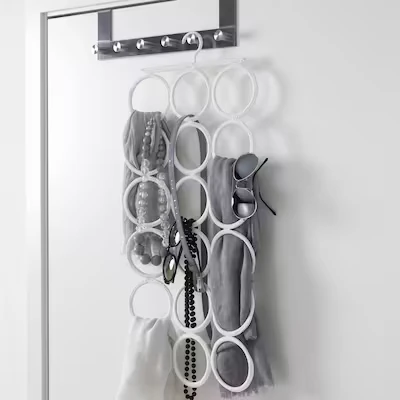 Ne prend pas plus de place qu’un cintre mais permet de ranger au moins 18 accessoires différents.