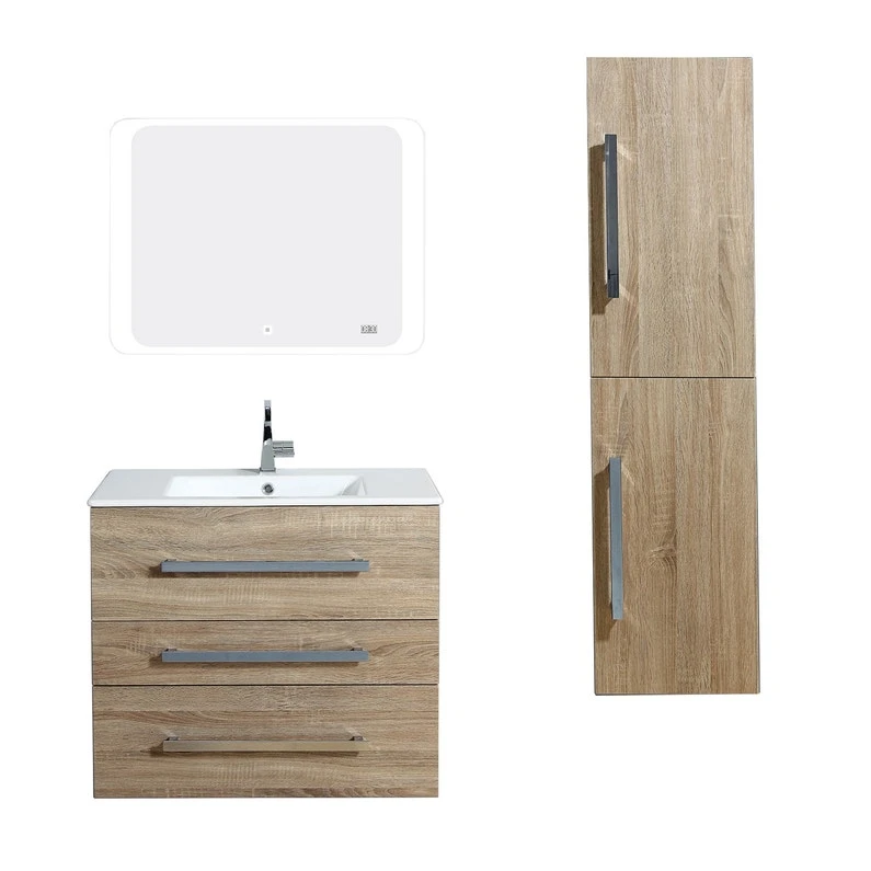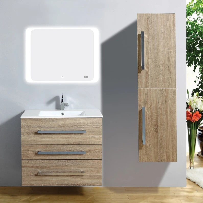 Meuble de salle de bains Senso 80 cm . Plan vasque céramique, panneux et façades en MDF 18 mm. Meuble livré monté à suspendre ou à poser (livré avec 2 pieds), Tiroirs à ouverture total équipés de coulisses soft closing. Miroir Led avec horloge et interrupteur sensitive Touch, livré avec colonne à suspendre 2 portes