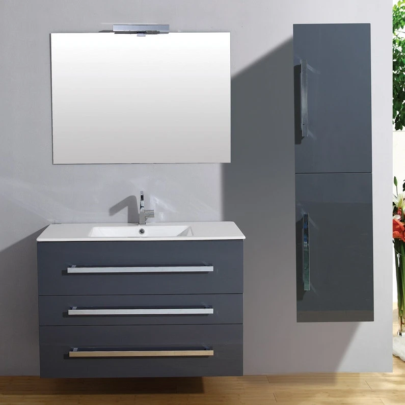 Meuble de salle de bains Senso 100 cm . Plan vasque céramique, panneux et façades en MDF 18 mm. Meuble livré monté à suspendre ou à poser (livré avec 2 pieds), Tiroirs à ouverture total équipés de coulisses soft closing. Miroir sur panneau bois avec applique halogène, livré avec colonne à suspendre 2 portes