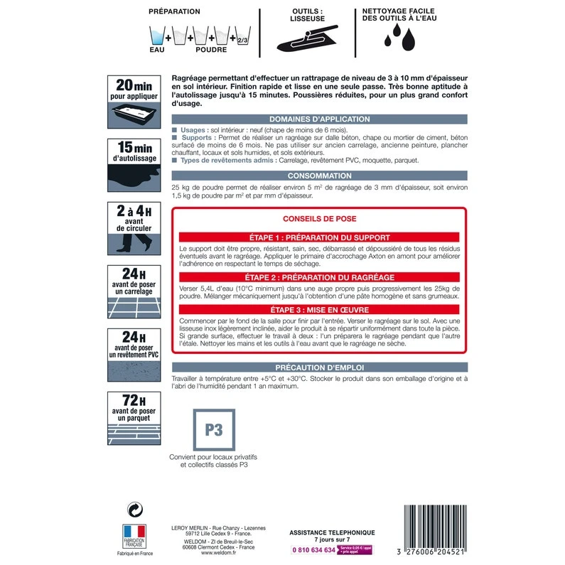 | Epaisseur du ragréage (en mm) | Ragréage 10 mm |