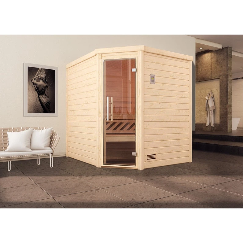 En Général: Dimensions extérieures: 195x195x203 cm, porte vitrée aspect graphite, équipement: 2 couchettes stables (55 cm profondeur) 1 couchette transversale (50 cm profondeur) 2 appuie-têtes, protection de poêle et tapis de sol, porte sauna avec fermeture magnetique 2 points, montable côté droit ou gauche, Sécurité et Service: Passe-câbles intérieur pour le raccordement du poêle du sauna, matériel de montage complet et notice de montage hauteur minimum: 220 cm